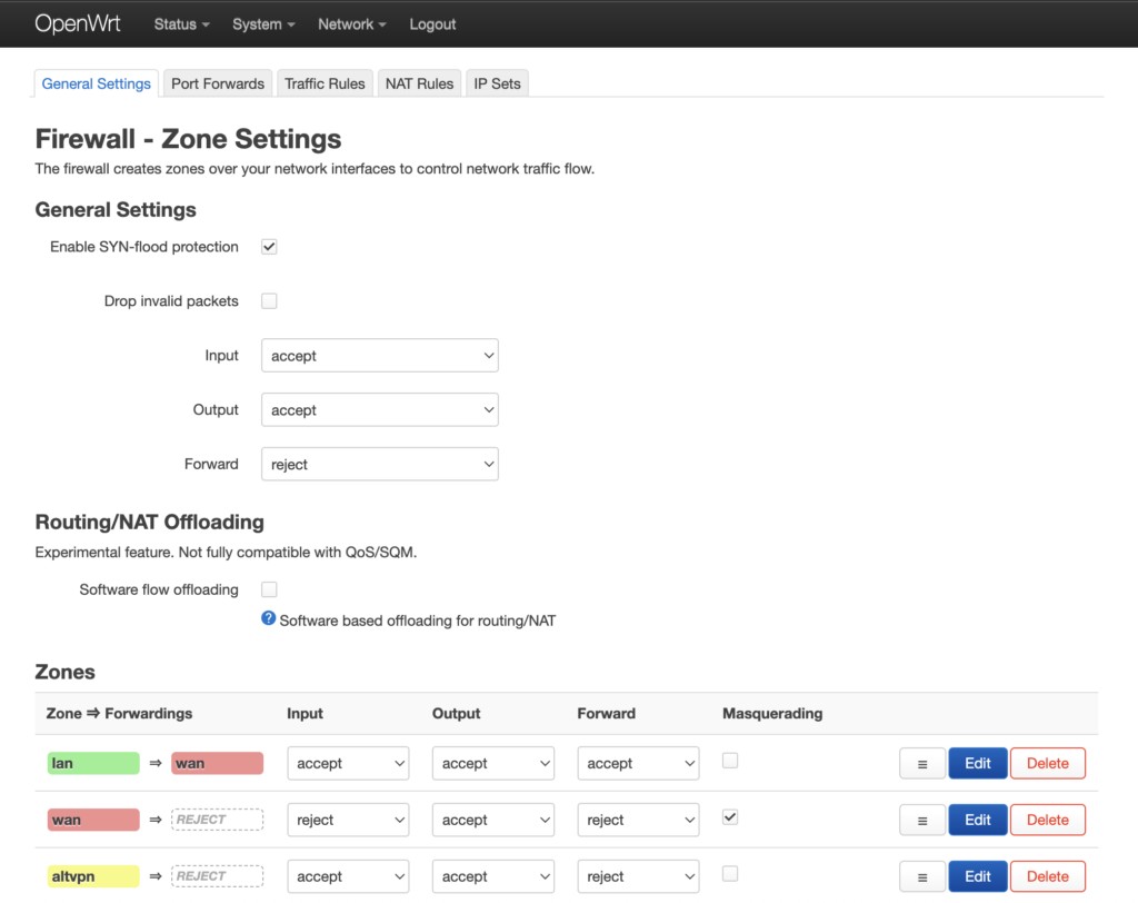 Необходимо перейти в меню Network → Firewall и нажать кнопку Edit напротив зоны lan